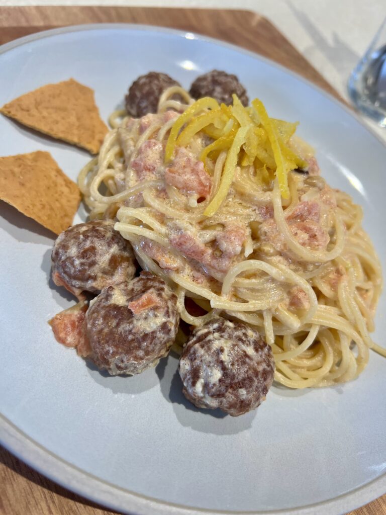 私が食べたのは『鶏ミートボールのゆずクリームスパゲッティ 酒かすチップを添えて』です!!